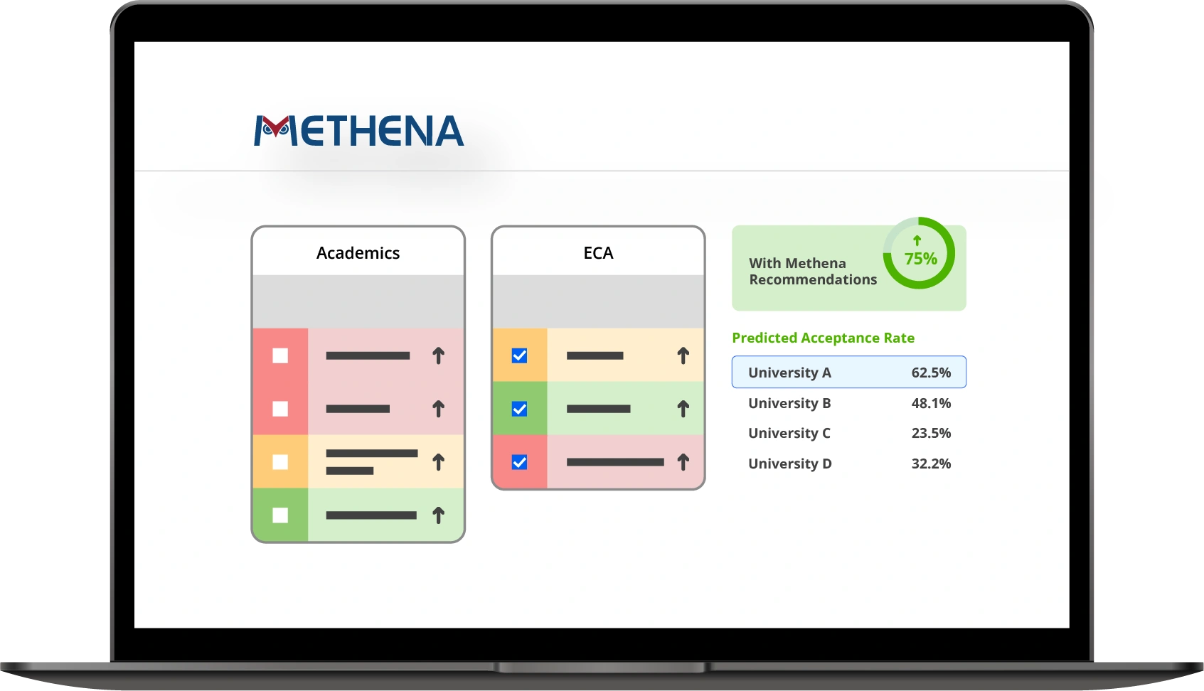 Methena redefines college application analysis by providing actionable strategies and targeted recommendations that empower students to improve their chances of admission.